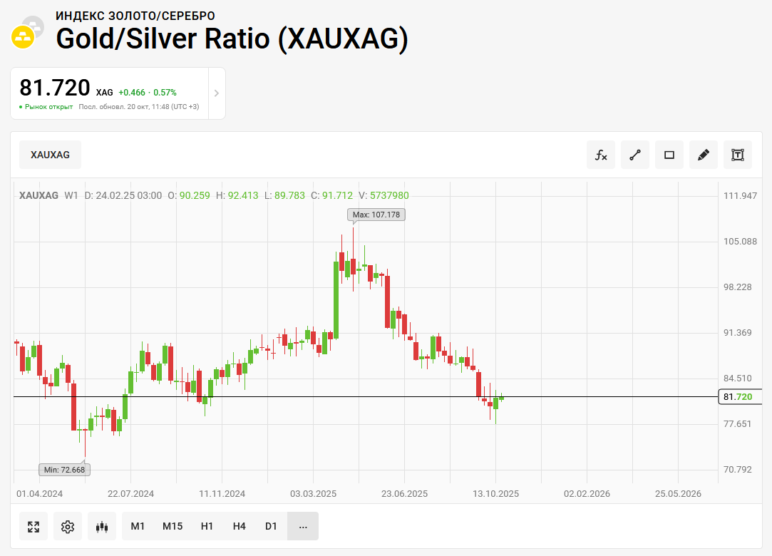 Посмотрим на индекс ЗОЛОТО/СЕРЕБРО — совпадает с нашим графиком!