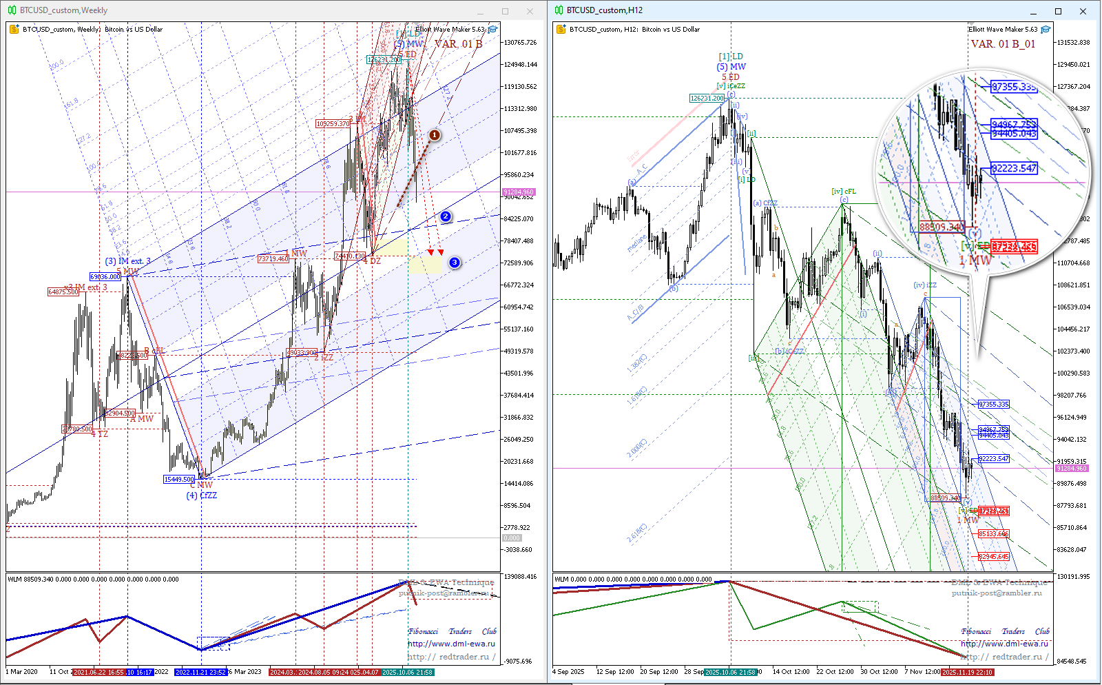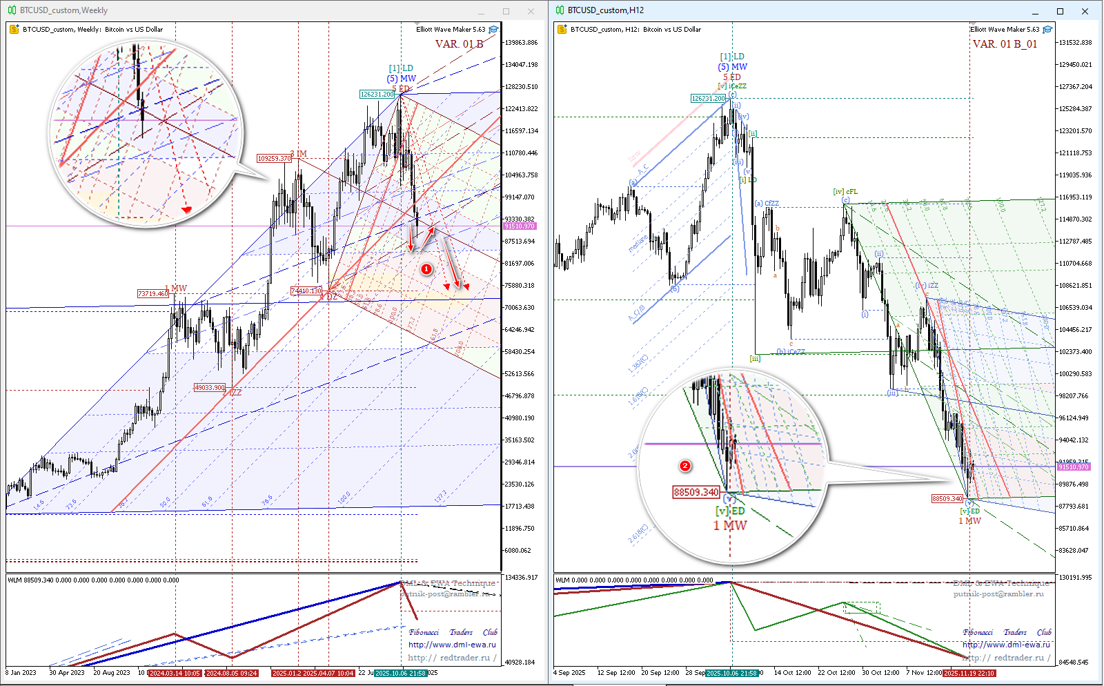 Но на младших волновых уровнях пока нет пробоя границ красных зон, соответственно нет и подтверждения формирования восходящего разворота (см. график справа).